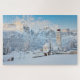Photo jigsaw puzzle of the church of Colfosco covered in snow with in the background the Sella Group Dolomites mountains in a beautiful winter landscape in Alta Badia, South Tyrol, Italy.