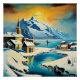 The A.I. created interpretation of a serene winter scene unfolds with a snowy fjord landscape that includes a church, houses, and mountains under a warm-coloured sky. A river cuts through the snow, leading the eye toward the sea where a solitary boat sails silently.