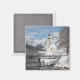 Souvenir photo magnet with a church under a layer of snow next to a mountain stream and a bridge with Alps mountains in the background in a winter landscape in Ramsau bei Berchtesgaden in the Berchtesgadener Land in Bavaria, southern Germany, near the border with Austria.