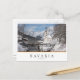 Photo postcard of a church under a layer of snow next to a mountain stream and a bridge with Alps mountains in the background in a winter landscape in Ramsau bei Berchtesgaden in the Berchtesgadener Land in Bavaria, southern Germany, near the border with Austria with a white edge and in a white box the text 'Bavaria, Germany', with stripes in black, red and yellow, the colours of the german flag.