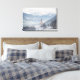Canvas landscape print of the church of St. Pankraz in an alpine landscape in the snow surrounded by clouds and fog on a hill with a view over Zillertal valley with the Alps mountains in the background in Fügen, Austria in winter.