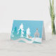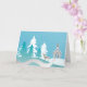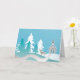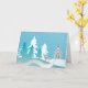 Illustrated greeting card with a church in the woods, snow falling and a lone dear keeping watch.