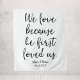 We love because he first loved us church wedding backdrop banner decorations with bride and groom names and the date. Design in black and white with religious sayings. Also great for a wedding party, ceremony, as aisle decor, wedding table decorations, wedding shower, and more. Use it to hang it on a wall, arch, or photography stand.