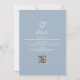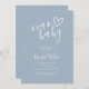 A modern minimalist all-in-one baby shower invitation featuring a cute hand-drawn heart, registry QR code, and event details set with stylish typography on a dusty blue background. Designed by Thisisnotme©