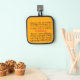 I ordered this product for my Mom as a gift and to check the product quality. It is a good thickness and great quality I am happy to report. She also advised that it will do a wonderful job in protecting her counters from hot pots and will last a really long time- durable. Printing is as expected and color is exactly her color of orange.