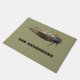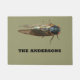 Welcome guests or maybe scare them away with this doormat that features a giant photo of a cicada with red eyes. Below the bug is a space to add a name or other message in bold black lettering. The photo and text are set against an olive green coloured background.