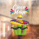 Cinco de Mayo with gold border with a floral Mexican folk pattern on the front with a moustache cactus wearing a sombrero.