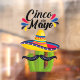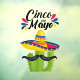 Festive holiday invitation for Cinco de Mayo or any Mexican-themed event with gold border with a floral Mexican folk pattern on the front with a moustache cactus wearing a sombrero. Pattern with guitars on the back.