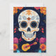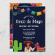 Festive holiday invitation for Cinco de Mayo or any Mexican-themed Birthday Party event with gold border with a floral Mexican folk pattern on the front with a moustache .