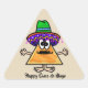 Use these for parties, on envelopes or invitations, etc. ... They feature a cheese-topped nacho chip wearing a sombrero. Below is "Happy Cinco de Mayo" but you can change the text for another observance, fiesta, birthday party, etc. Due to the graphic shape, this is only available on triangle stickers. Designed by Sheila Cicchi, Brownielocks.com, All Rights Reserved.