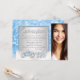 Cinderella Quinceanera invitation with beautiful silver and blue horse and carriage on a blue bokeh and diamond sparkle bokeh background. This beautiful fairy tale princess Quinceanera invitation is easily customised for your event by simply adding your photo and event details in the font style and wording of your choice. This is a printed design with no real diamonds, glitter, feathers, etc.