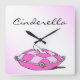 A custom wall clock fit for a princess with a script font and Cinderella's glass slipper on a pillow in light and dark pink, antique art restored from a vintage drawing in a fairytale storybook. Click Customise It to change fonts, background colours and more.