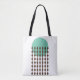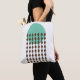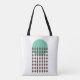 This tote bag has a mid-century modern design with a sea-green circle with brown diamond chains.