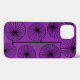 This phone case has a mid-century modern design of circles with starbursts inside connected together with black lines, looking like a mobile.