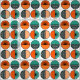 This baby t-shirt has a mid-century modern design of half-circles, some with starbursts, some with small circles, and some just solid, in orange and teal.