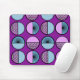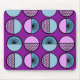 This mouse pad has a mid-century modern design of half-circles, some with starbursts, some with small circles, and some just solid, in blue and purple.