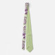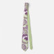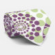 This necktie has a design of circles decorated with lines and circles made of repeating dots in eggplant and green.