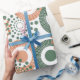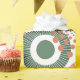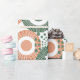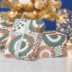 This wrapping paper has a design of circles decorated with lines and circles made of repeating dots in retro green and coral.