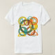 This t-shirt has a mid-century modern design of circles and semi-circles in orange, yellow, green, brown, and turquoise on a field of white. If you want the same design with different colours, message me.