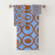 This towel set has a geometric design of circles in rows with circles or ovals inside in brown on a field of blue.