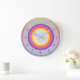 This wall clocks face is rings of colours of the rainbow as are the numbers of the clock. It is bright, cheerful and as colourful as a rainbow against a background of grey.
