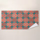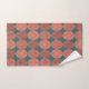 This towel set has a mid-century modern design of open circles on closed circles in shades of orange on a field of teal.