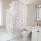 This shower curtain has an art deco design that looks like likes on a circuit board. The lines are running vertically in dusty rose on a field of white. Want a different colour? Message me.