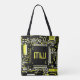 Modern design featuring a close up of a computer circuit board in yellow, black and white. Bag with a customisable design for you to personalise with your own text, pictures and ideas. Created using an original photograph and digital techniques by Jess Perry.