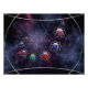 An illustration of infinity, crossing the universe to combine the microscopic and the telescopic in a rainbow display of shapes and colours. A column of multi-coloured atoms of blue, pink, red, and green circled by silver rings, spiralling across outer space against a backdrop of colourful fractal galaxies.