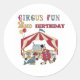 Circus 2nd Birthday featuring the big top with a clown, seal, elephant, monkey, lion, tiger, zebra, and colourful, fun text.