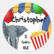 Circus Carnival Custom Name, Big Top design with circus tent, elephant, popcorn and balloons in bright green, red, yellow and blue. Add boy girl or kids name and age. Fun birthday party favour for a carnival theme.