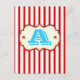 A great DIY product to personalize your carnival party! Red and white stripe background with an old fashioned letter style in bright blue. Spell out "Happy Birthday", your child's name, or any other message by creating one card per letter of each word you want to create. Then use a hole punch to make a small hole in the upper corners and string the cards onto a length of pretty ribbon or twine. Voila!
