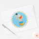 This circus themed sticker features a blue background surrounded by a repeating patter of red, blue, yellow and green stars. A cute circus elephant stands on a circus ball in the middle of the sticker.