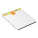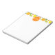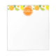 A white notepad with a pattern of smiling orange, lime, grapefruit, and lemon characters with green leaves. At the top is a name and monogram combination that can be customised. The pad is mostly blank with plenty of space for writing.
