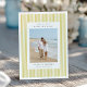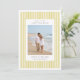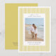 Announce your upcoming wedding with these elegant save the date cards by Redwood and Vine Design Co, featuring a vertical photo against a classic preppy pinstripe background in citrusy yellow green and crisp white. Customize the back with additional text and a custom QR code leading to your wedding website for more information.