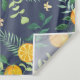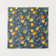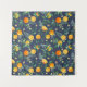 Tropical vibes with oranges, leaves, and flowers on blue.