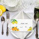 Lemon and orange watercolor citrus wedding place cards with table number. Unique watercolor painting of oranges and orange segments with green foliage and yellow lemons on a branch with greenery and lemon segments. original artwork by artist Catherine Sweetman