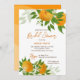 Citrus oranges summer bridal shower invitation template. Orange bunches with oranges, orange blooms and green leaves.