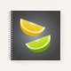 A citrus spiral notebook, with lemon and lime slices on the dark grey background