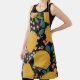 A tropical summer awaits in this hand-drawn seamless pattern, filled with lemons and flowers on a dark background.