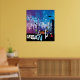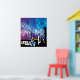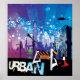 City buildings urban with closed road poster print, featuring city buildings and skyscrapers behind a fence and a road closed with some barriers. Behind them the sky is of blue and purple hues with rays.