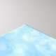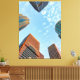 The image captures a low-angle view of towering skyscrapers against a backdrop of a bright blue sky dotted with fluffy white clouds. The buildings are arranged in a semi-circle, with the tallest one in the centre, creating a sense of grandeur and urban sprawl.