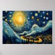 Night Cityscape with Moonlight, Starry Sky and Light TrailS Van Gogh Style Illustration for Wall Art and Home Decor