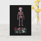 A skeleton with a pink head and candy cane bones is wearing a Santa hat.
