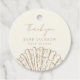 Elegant clamshell baby shower favor tag featuring cream color background and beige color text in elegant calligraphy and typography. Accompanied by a clamshell illustration.