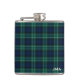 Monogrammed stainless steel flask with the family tartan for Clan Abercrombie. Royal blue and forest green Scottish plaid pattern from 1805, with black and white accents.
