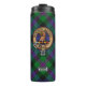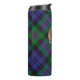 Clan Baird crest badge surrounded by a strap and buckle over tartan background. Custom text.