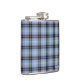 Monogrammed flask in the family tartan of Clan Bell, a traditional plaid pattern in light blue and black, with bright red, green, and yellow accents. Also known as Bell of the Borders. Available in two sizes.