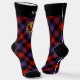 Clan Brown crest badge surrounded by a strap and buckle over tartan background. Custom top stripe colour. Custom text on each sock.