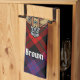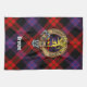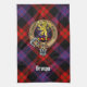 Clan Brown crest badge surrounded by a strap and buckle over tartan background. Custom text.